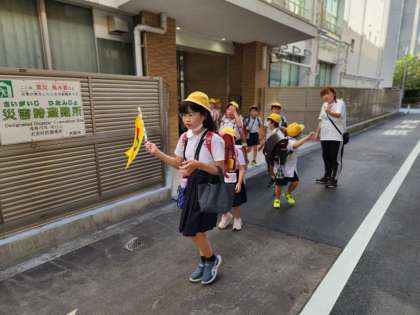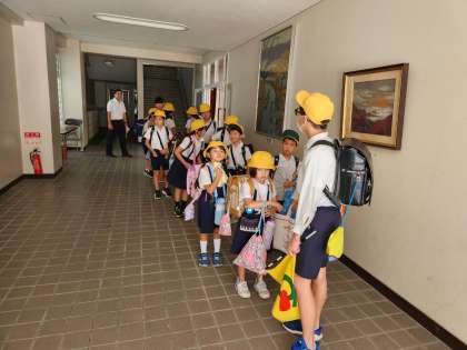 8〜9月は台風シーズンということで、台風が近づいてきたときや雨・風が強くなった場合の注意点や集団下校の仕方について学びます。