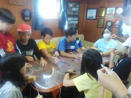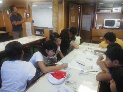 海図教室では現地点から目的地海遊館までのコース、距離、ふねのはやさから何時に出発すればよいか求めました。14時半に着くためには12時に出発です。