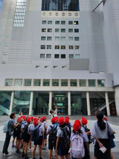 社会科の学習の一環として、自分たちが住む地域、大阪の町の様子を、360度見渡せる高い場所から見学します。