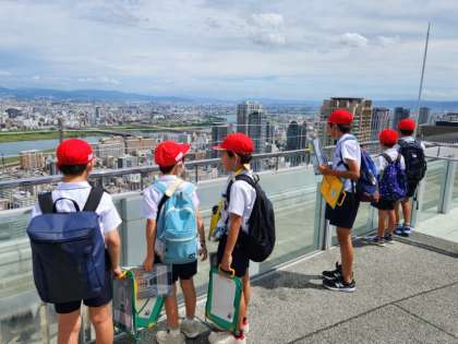 全員で大阪の町を眺めた後、今度は各自で、東西南北それぞれの方角から眺めた大阪の町の特徴について、気づいたことをメモしていきます。