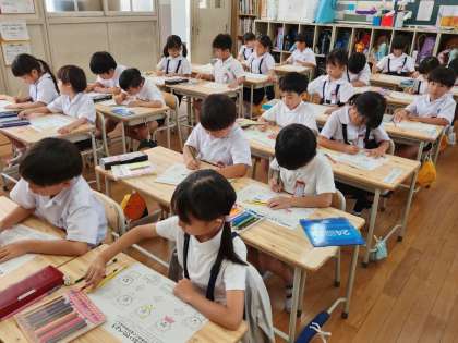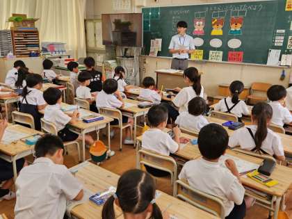 栄養教諭の先生にお越しいただき、普段みんなが食べているものや好きな食べ物、きらいな食べ物等、身近な話題のお話から、バランスよく「食べる」ことの大切さを教えていただきました。