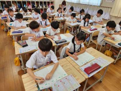 かんじドリルの使い方や、練習ノートの使い方を先生から教えてもらい、みんな一生懸命に、いい字を書こうと頑張っていましたよ!