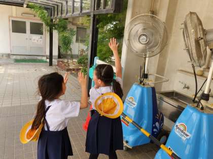 子どもたちの活動に合わせて、ミスト扇風機も稼働しています。