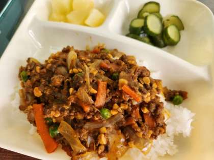 今日の大豆入りキーマカレーには、新食品の「豚レバーチップ」が使われています。