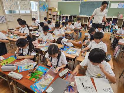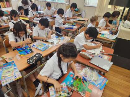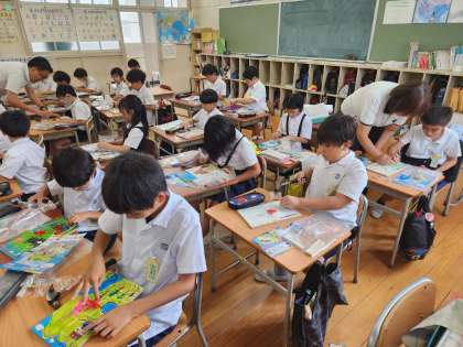 3年生は今日の図画工作の時間に、先日から作り始めている「コリントゲーム」の制作の続きを行いました。