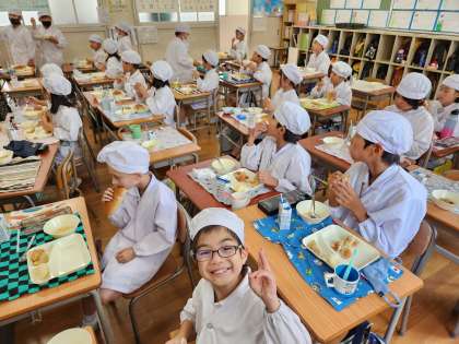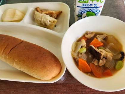 他校の給食では「皮ごと」提供されることが多い「なし」ですが、今日は調理員さんがすべての「なし」の皮をむいて、子どもたちが食べやすいようにしてくださいました。