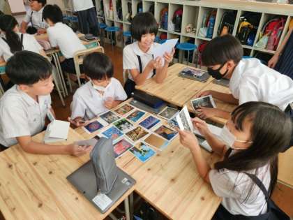 今日は「アートカード」を使って作品の良さや違いを見つけ、美術作品の美しさや特徴を自分の感性でとらえるという活動を行いました。