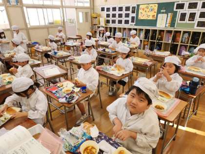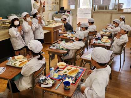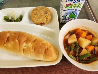 「おさつパン」には、サツマイモのダイスが入っており、ほんのり甘くやわらかいパン生地が子どもたちに好評です。今日のおかず「ケチャップ煮」と、よく合う組み合わせになっています。