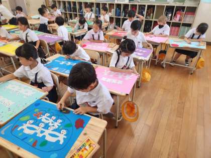 今日は先週の図画工作の時間に、画用紙を切り取って作った作品を色画用紙の台紙にはりつけ、パスで絵を描いていきました。