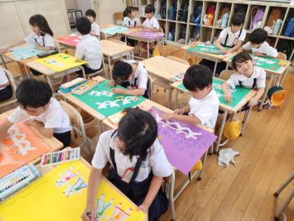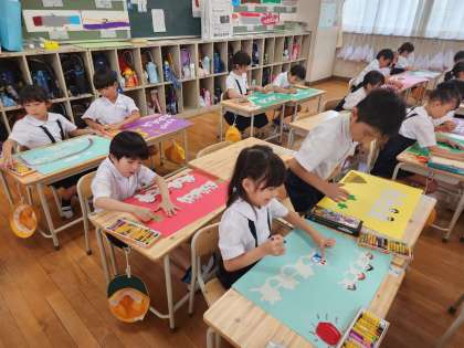 図画工作の時間に、はさみと画用紙を使った作品づくりに取り組んでいる1年生。