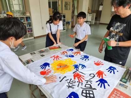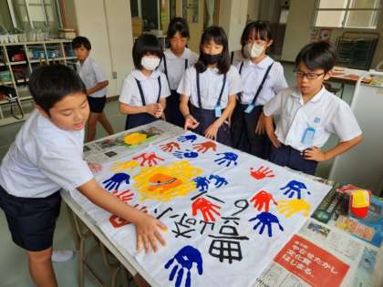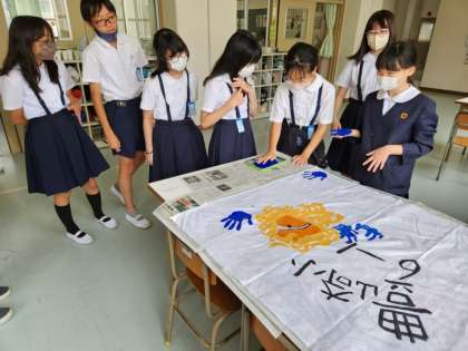 6年生の子どもたちの手形が入った旗が、修学旅行当日、船上ではためきます!