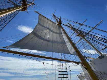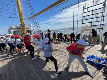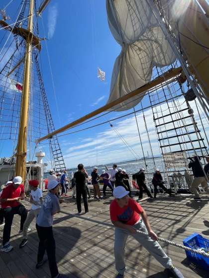 ツー・シックス・ヒーブ の掛け声で力を合わせて帆をはりました。