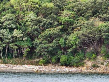 遠くからでも、非常に多くのごみが流れついているのが見えます。