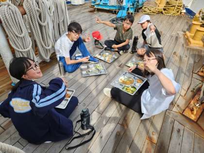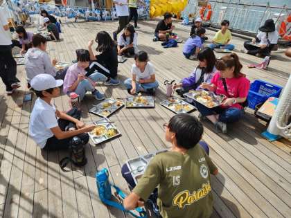 最後の食事は、全員がデッキに出て、海を眺め、潮風を感じながら、いただきました!