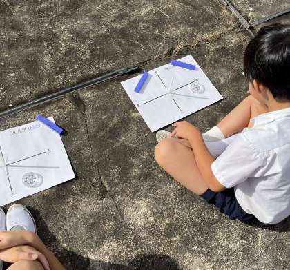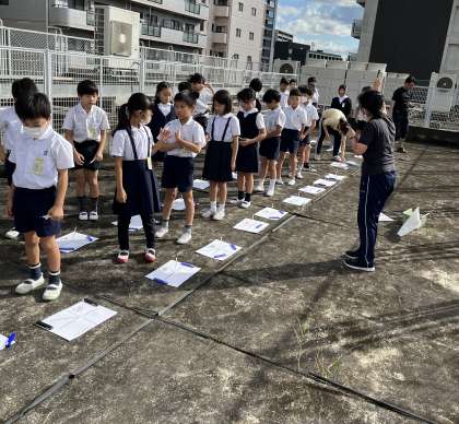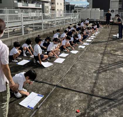 今日は3年生は普段は上がらない屋上で太陽の影の観察をしていました。影の動きから、この後太陽の動き、地球の動きについて考えていきます。豊崎小学校は周りに高層ビルが多く、校舎自体も小学校としては珍しい6階建てのため、空や太陽の観察には決して好条件とは言えませんが、屋上からは太陽の様子、影の様子がはっきりと確認できました。