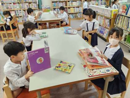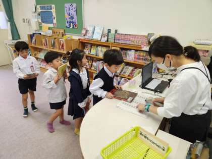 火曜日は司書さんが図書室に来られる日で、本の貸し出しをしたり、本の相談にのってくださったりしています。多くの学年が図書室を利用しています。