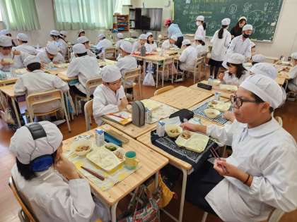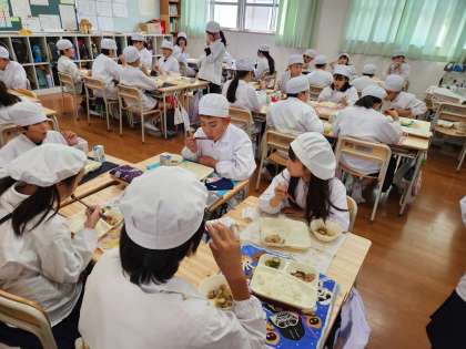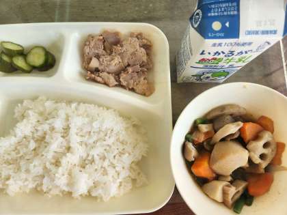 今日は、さといもやれんこん、しめじなど旬の食材の他、にんじんやたまねぎ、さんど豆など、たくさんの野菜が「ふきよせ煮」に使われています。