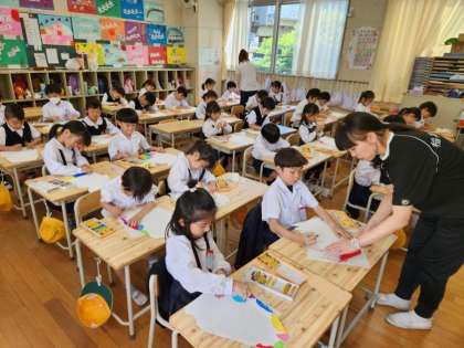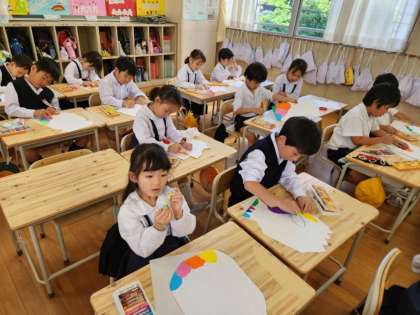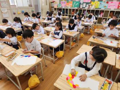 先週の図画工作の時間に画用紙を切り取って作った不思議な形をした「つぼ」に、今日はパスを使って色ぬりをしていきます。