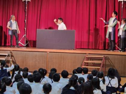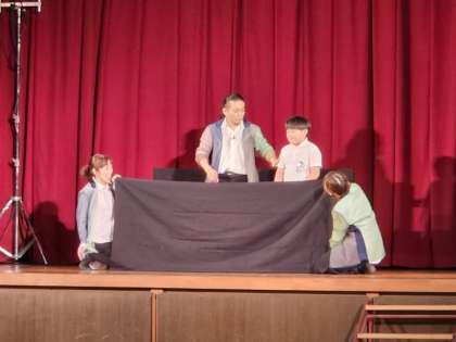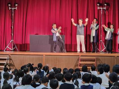 高学年の子どもたちと先生が舞台に上がって「パントマイム」を実演!