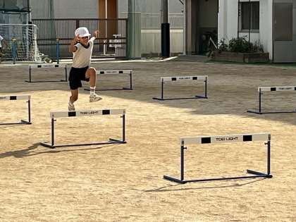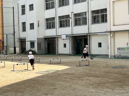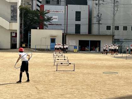 過ごしやすくなった運動場で5年生がチーム対抗のハードルリレーをしていました。ハードルだけでなく、最後にフラフープも使ってくぐったり、跳んだり、回したりして帰ってきます。体育の授業ですが、白熱した競争で応援の声も上がっていました。