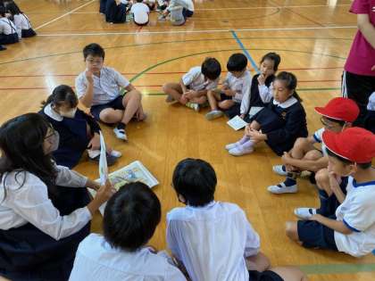 今日の全校集会は、来週行くたてわり遠足の説明会でした。