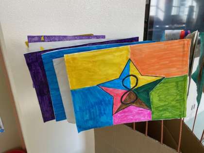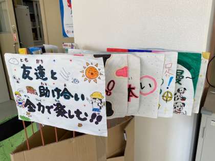 どの班の旗もとても素敵です。職員室前に、遠足当日まで飾ってあります。27日晴れるといいですね!