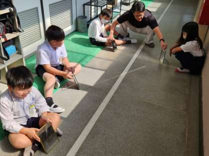鏡ではね返した日光は、反射をしてどのようにすすむのか、今日は実際に鏡を使って実験を検証を行いました。