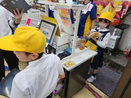 店員さん役の子どもたちは、ドキドキしながらバーコードリーダーの機械を操作し、お客さん役の子どもに