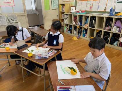 パソコン・イラストクラブでは、「秋の味覚を描こう」というテーマで、運動場の木になっていたみかんの絵を描いていました。