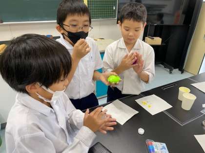 調理・手芸クラブでは、前回に引き続き毛糸でコースター作り、科学クラブでは、洗濯のりやホウ砂などをまぜてスライムを作っていました。