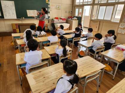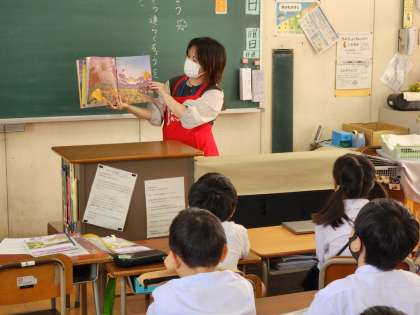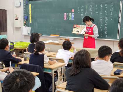今日は地域の読みきかせボランティアサークル「えことば」さんにお越しいただき、各教室で子どもたちに絵本の読み聞かせをしていただきました。