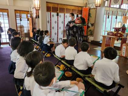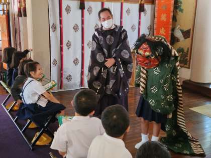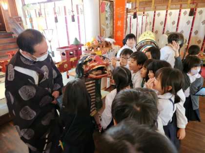 お祭りで使う“獅子舞”のお面を見せていただき、実際にお面をかぶらせていただきました。子どもたちは大喜びでした!