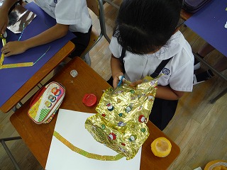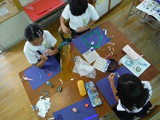 光るテープや折り紙,アルミホイルなど自分たちで持ち寄った材料で「きらきらの世界」をつくりました。