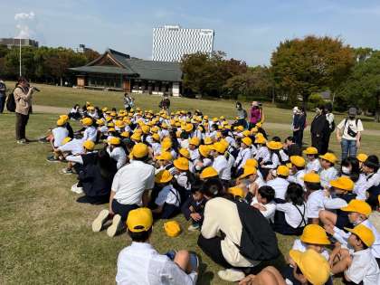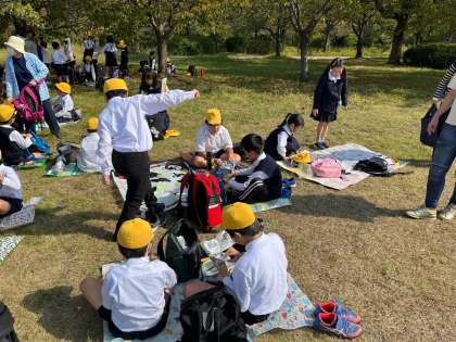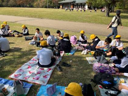 全員オリエンテーリングを終え、西の丸庭園に集まりました、待ちに待ったお昼ご飯です。少し暑く、風もよく吹いていますが、心地よいお天気です。