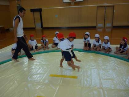 初めてのまわしに戸惑う子どもたちでしたが,友だちに手伝ってもらいながらかっこよくまわしを締めることができました。