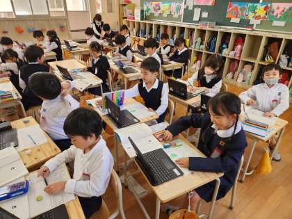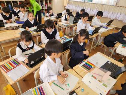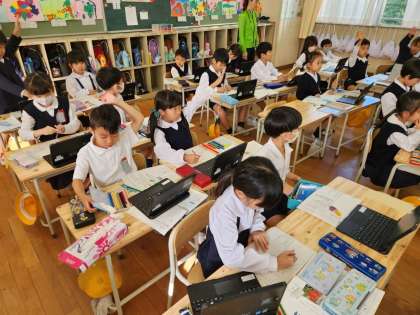先日、端末のカメラ機能を使って校内の花や木、生き物などを写真に収めた1年生。