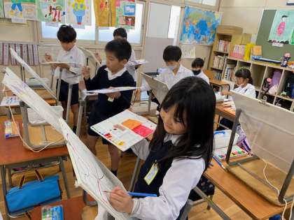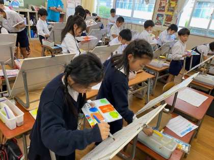 3年生は、絵の具の混色を学習した後、ペンで描いた絵に彩色をしていました。椅子をイーゼルの様に使い、みんな画家みたいですね。