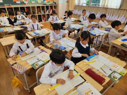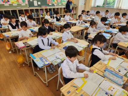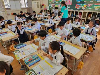 1年生は算数の時間、「くりあがりのあるたしざん」の学習をしています。