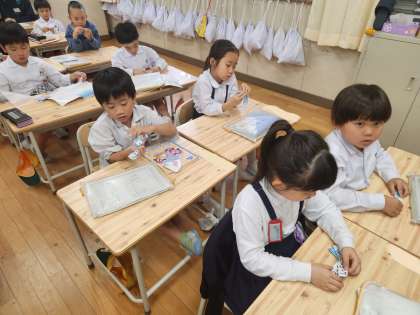 計算式を見てすぐに答えが言えるように、「けいさんカード」を使って暗算の練習をしています。