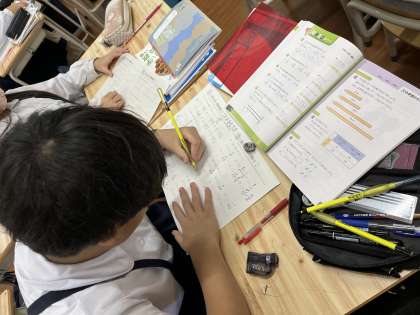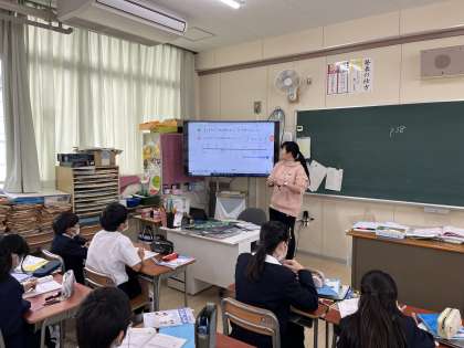 5年生は2つの教室に分かれて少人数で算数の授業を行っています。分数から小数に直したり、その反対を練習しています。目的に応じて分数と小数を使い分け、大小関係などを比較しています。小数に直す際には小数第三位程度まで正確に計算できる必要があり、これまでの学習の積み上げが必要であることがよく分かります。