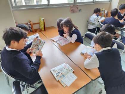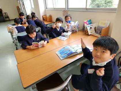 休み時間には、多くの子どもたちが読書スペースで本を読んでいました。