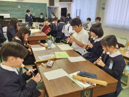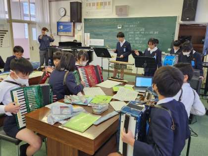 6年生は音楽の時間に、ディズニーアニメ「アラジン」の主題歌「ホール・ニュー・ワールド」の合奏の練習に取り組んでいます。