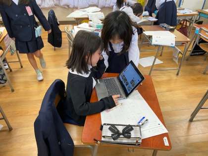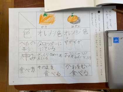 2年生が、身近にある2つの物を比べて、同じところと違うところをワークシートにまとめていました。