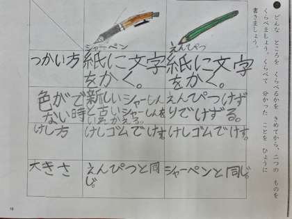 ペンとシャープペンシル、砂糖と塩、スパゲティとそうめん、自転車と一輪車など、自分で比べる物を考えて分かりやすくワークシートにまとめていました。