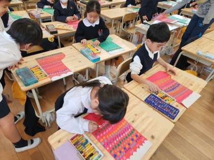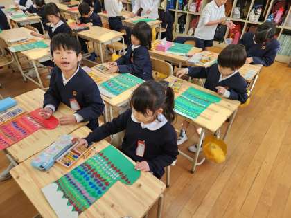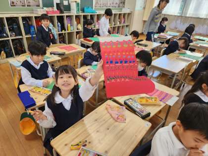 1年生が図画工作の時間に「クリスマスブーツ」の絵を描いていました。