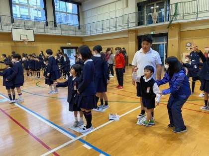 たてわり班の高学年と低学年がペアとなり、新聞紙の上に乗ります。低学年が舞台上の集会委員とじゃんけんをして、勝てばそのまま、負ければ新聞を半分に折っていきます。新聞紙が小さくなって、2人乗ることができなくなると終了です。