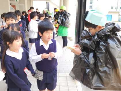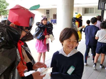 講堂の出口で、元気よくあいさつができた人に“シール”をプレゼントします!