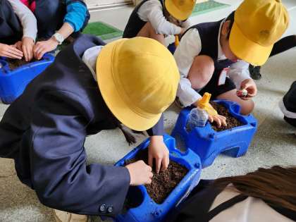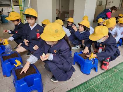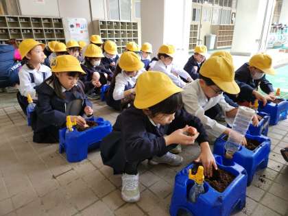 「花いっぱい運動」の鉢植えに続き、1年生はチューリップの球根を植木鉢に植えました。