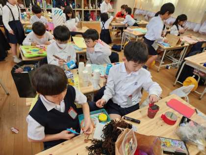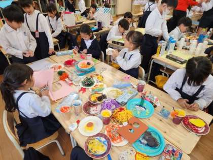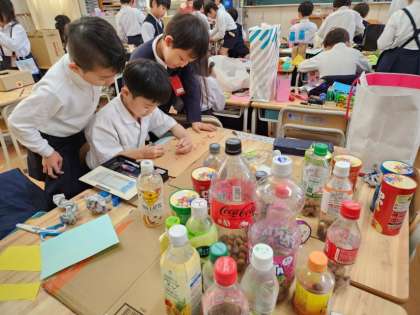 1年生は生活科の時間に、みんなで集めた“どんぐり”や“まつぼっくり”などを使って、「おみせやさん」あそびの準備をすすめています。