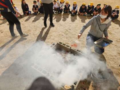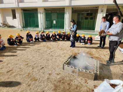 “焚き火”を使った“やきいもづくり”に、子どもたちは興味津々です!